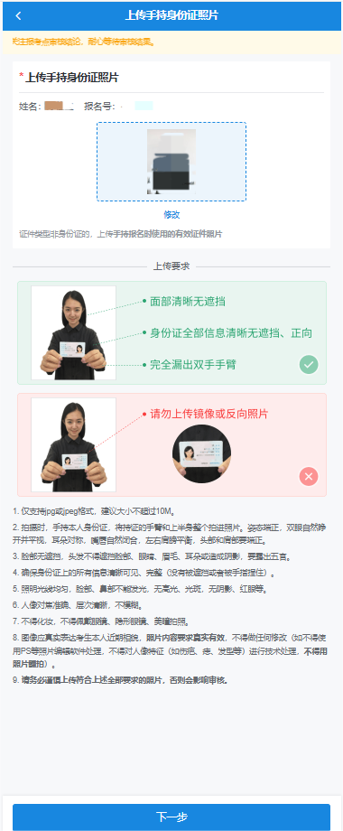 注意:參照?qǐng)D示,嚴(yán)格按照準(zhǔn)考證照片上傳要求,進(jìn)行拍攝并上傳,注意不能自拍。點(diǎn)擊“下一步”。如考生被錄取,該照片將用于人事檔案材料以及在學(xué)期間相關(guān)證件等用途。