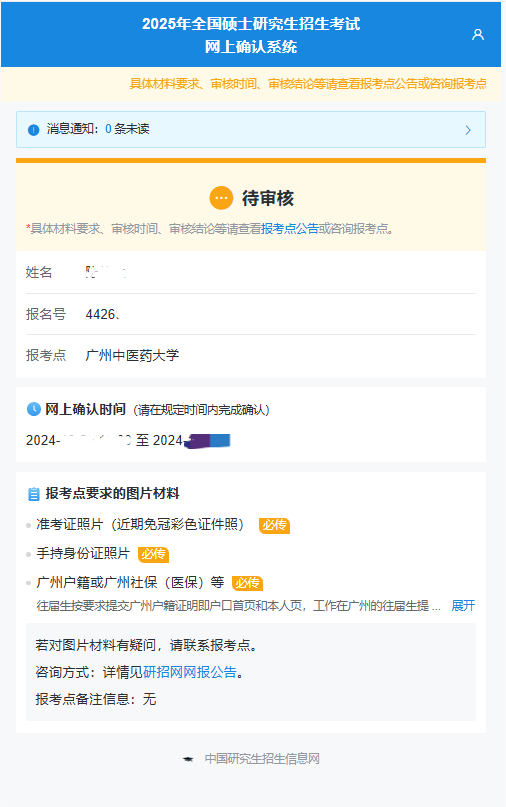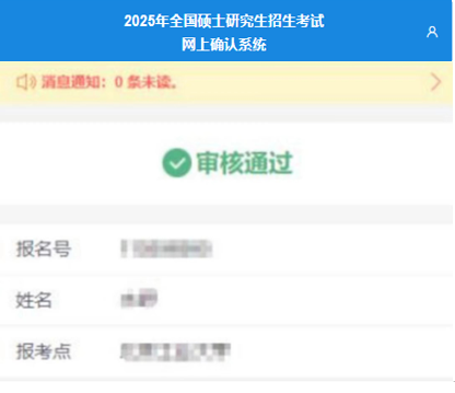 提交后請(qǐng)耐心等待審核結(jié)果,審核結(jié)果將會(huì)通過(guò)網(wǎng)上確認(rèn)系統(tǒng)及學(xué)信網(wǎng)短信告知。請(qǐng)考生及時(shí)登錄系統(tǒng)確認(rèn),反饋結(jié)果顯示“審核通過(guò)”說(shuō)明您已經(jīng)完成了2025年研究生報(bào)名信息確認(rèn)工作,請(qǐng)認(rèn)真準(zhǔn)備考試。
