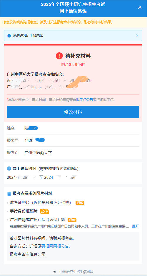 凡是提示“審核不通過(guò)”的考生請(qǐng)根據(jù)提示內(nèi)容及時(shí)補(bǔ)充材料再次審核。網(wǎng)上確認(rèn)期間如有問(wèn)題,請(qǐng)考生在11 月5日17:00 前與我校研招辦電話聯(lián)系,并按照要求更正信息后完成確認(rèn),以免因?qū)徍瞬煌ㄟ^(guò)沒(méi)有充足的時(shí)間準(zhǔn)備補(bǔ)充材料。聯(lián)系電話:020-39358482(網(wǎng)上確認(rèn)期間咨詢時(shí)間為:上午9:00-12:00,下午14:00-17:00)