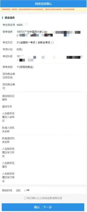 注意:請(qǐng)仔細(xì)核對(duì)網(wǎng)報(bào)信息,確認(rèn)無(wú)誤后,勾選“我已確認(rèn)以上報(bào)名信息準(zhǔn)確 無(wú)誤”并點(diǎn)擊“確認(rèn),下一步”。