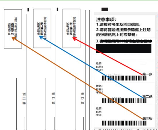 2.在監(jiān)考員允許下打開試題袋后,取出我校提供的答題卡(3張共12頁(yè)),請(qǐng)務(wù)必按照答題卡(紙)順序和三張條形碼上的順序,依次在條形碼粘貼區(qū)域粘貼,每張答題紙對(duì)應(yīng)一張條形碼,如下圖所示: