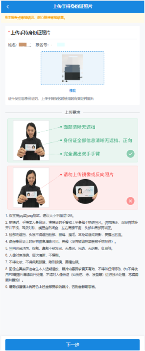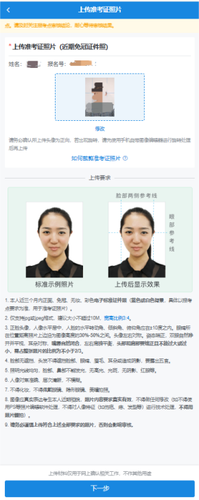注意:參照圖示,嚴(yán)格按照準(zhǔn)考證照片上傳要求,進行拍攝并上傳,注意不能自拍。點擊“下一步”。如考生被錄取,該照片將用于人事檔案材料以及在學(xué)期間相關(guān)證件等用途。
