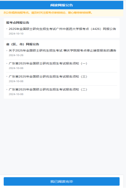 注意:請仔細(xì)閱讀報考點公告,因未按報考點公告要求,錯選報考點的考生造成報名無效等,不再補報。確認(rèn)后點擊“我已經(jīng)閱讀完畢”。