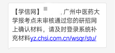 凡是提示“審核不通過”的考生請根據(jù)提示內(nèi)容及時補充材料再次審核。網(wǎng)上確認(rèn)期間如有問題,請考生在11月4日17:00 前與我校研招辦電話聯(lián)系,并按照要求更正信息后完成確認(rèn),以免因?qū)徍瞬煌ㄟ^沒有充足的時間準(zhǔn)備補充材料。聯(lián)系電話:020-39358482(網(wǎng)上確認(rèn)期間咨詢時間為:11月2日至5日上午9:00-12:00,下午14:00-17:00)