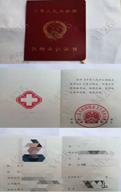 執(zhí)業(yè)醫(yī)師資格證的證書外皮封面頁(非內(nèi)頁)、發(fā)證單位蓋章頁、發(fā)證日期頁、個人信息