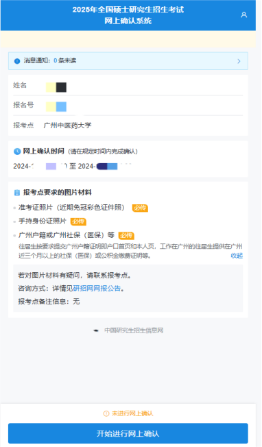 注意:請一定要留意“報考點要求的圖片材料”和“網(wǎng)上確認(rèn)結(jié)束的時間”,先準(zhǔn)備好相應(yīng)的材料照片,然后點擊“開始進行網(wǎng)上確認(rèn)”進行下一步操作,在規(guī)定的時間內(nèi)完成所有確認(rèn)工作。(圖1-圖11僅供參考,具體以研招網(wǎng)的頁面信息為準(zhǔn))