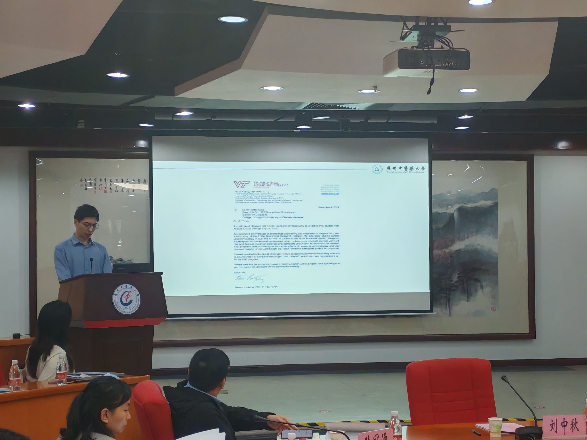 訪學歸國研究生代表第一臨床醫(yī)學院博士生曹艷紅結(jié)合訪學美國亞利桑娜大學的留學經(jīng)歷作經(jīng)驗分享與交流。獲項目資助擬前往美國弗吉尼亞理工大學訪學的第二臨床醫(yī)學院博士生袁嘉霖作訪學發(fā)言,承諾將以“厚德博學,精誠濟世”為揚帆,在訪學交流中做中國學術(shù)故事的講述者,展現(xiàn)中國青年學者風貌,展現(xiàn)廣中醫(yī)博士生風采。