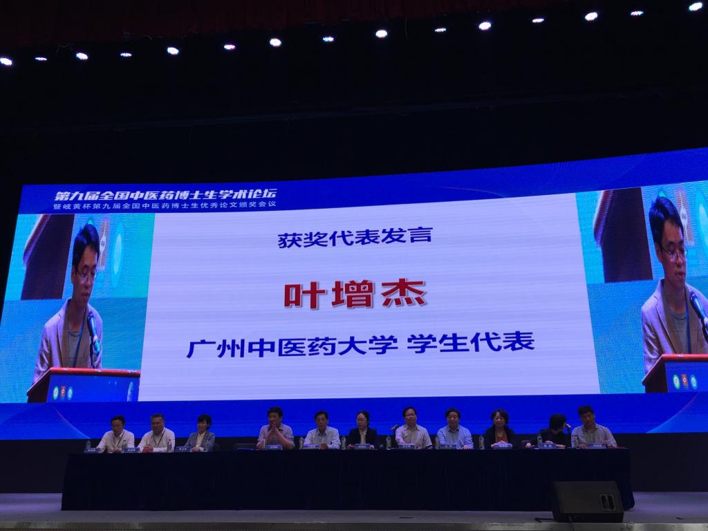 2018年4月3日,第九屆全國(guó)中醫(yī)藥博士生優(yōu)秀論文評(píng)選結(jié)果在湖北武漢揭曉,經(jīng)過(guò)專家初審、網(wǎng)絡(luò)盲審及現(xiàn)場(chǎng)答辯等環(huán)節(jié),我校共有九名博士生榮獲"全國(guó)中醫(yī)藥博士生優(yōu)秀論文獎(jiǎng)",其中鄭嘉儀同學(xué)(導(dǎo)師潘華峰教授)獲優(yōu)秀論文一等獎(jiǎng),陳鵬同學(xué)(導(dǎo)師林培政教授)、葉增杰同學(xué)(導(dǎo)師邱鴻鐘教授)、譚慶龍同學(xué)(導(dǎo)師曾星教授)獲優(yōu)秀論文二等獎(jiǎng)。我校榮獲評(píng)選活動(dòng)"優(yōu)秀組織獎(jiǎng)"。我校葉增杰同學(xué)作為全體優(yōu)秀論文獲獎(jiǎng)作者代表在大會(huì)上發(fā)言。