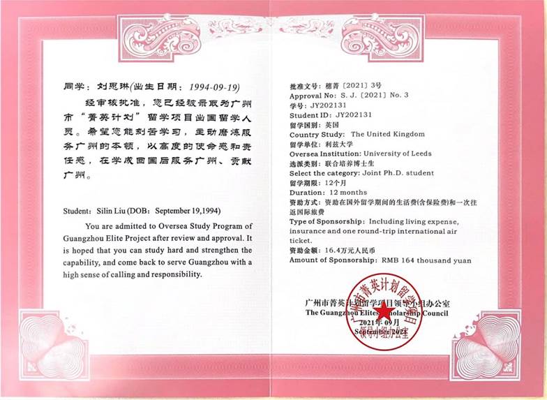 研究生劉思琳將赴英國利茲大學以聯(lián)合培養(yǎng)博士生身份進行生物醫(yī)學科學專業(yè)進行為期一年的學習。