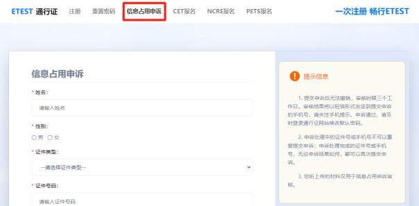 本次報(bào)考將繼續(xù)啟用“手機(jī)驗(yàn)證碼登錄報(bào)名平臺(tái)”與“身份證實(shí)名驗(yàn)證”雙重安全檢測功能,如考生安全檢測不通過,將無法報(bào)名。請考生注冊時(shí)務(wù)必使用本人手機(jī)號(hào)及身份證,如發(fā)現(xiàn)個(gè)人信息(身份證號(hào)、手機(jī)號(hào)等)被占用情況,請?jiān)谧皂撁纥c(diǎn)擊“信息占用申訴”(見下圖),并按頁面指引進(jìn)行操作。