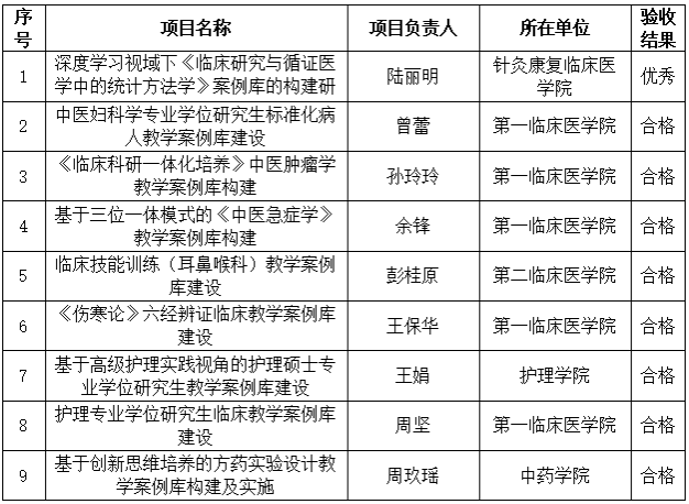 根據(jù)《關(guān)于開展2024年度專業(yè)學(xué)位研究生教學(xué)案例庫建設(shè)培育項目結(jié)題驗(yàn)收的通知》要求,經(jīng)各項目負(fù)責(zé)人申請、二級學(xué)院審核,研究生院組織復(fù)核驗(yàn)收,現(xiàn)將項目驗(yàn)收情況公示如下:
