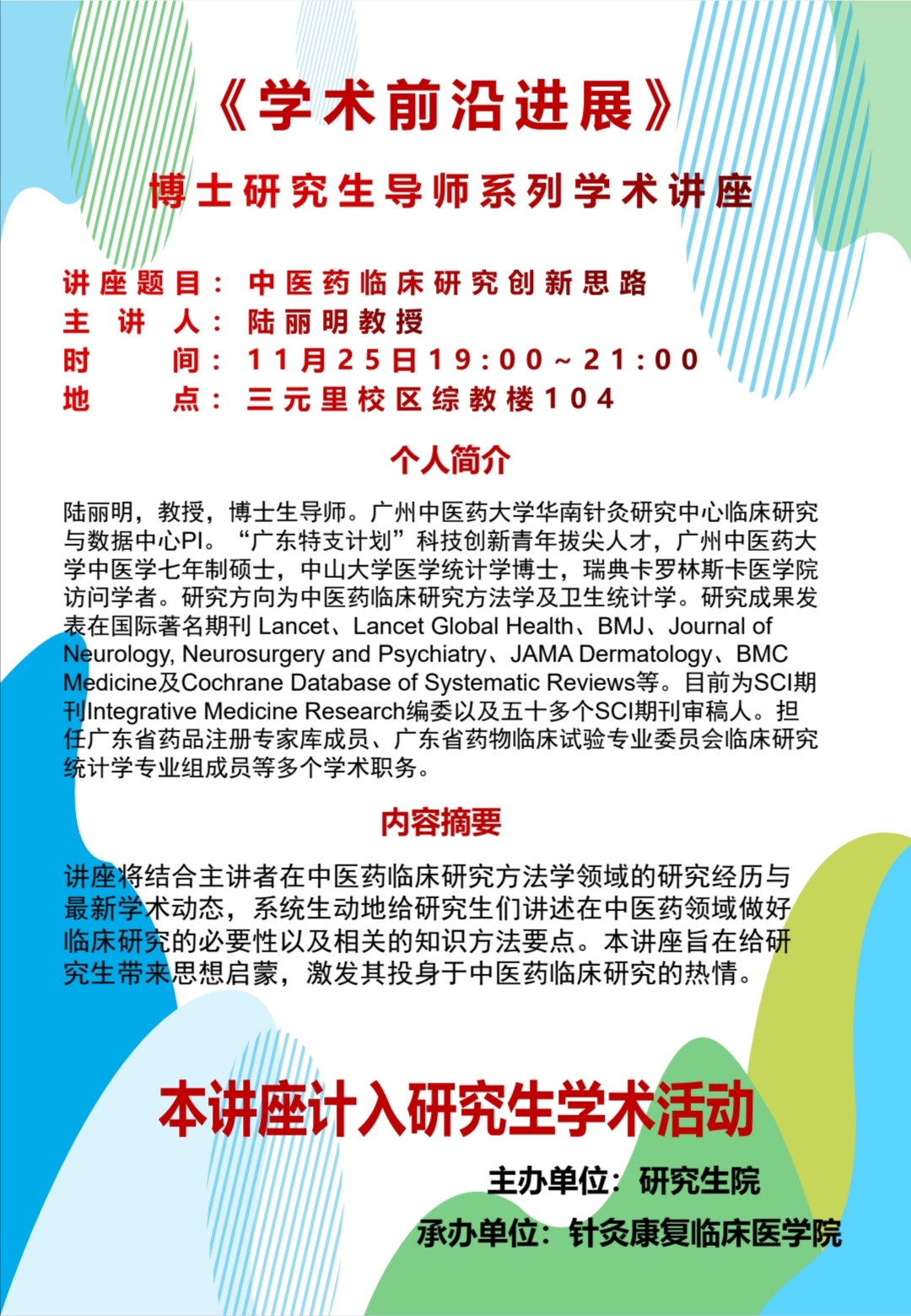 上一條:博導(dǎo)講座:關(guān)于“刺之要,氣至而有效”的認知(主講人:... 下一條:博導(dǎo)講座:中醫(yī)藥治療神經(jīng)退行性疾病的細胞自噬機制探討...
