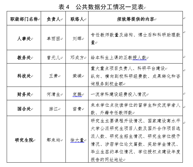 為保障填報數(shù)據(jù)的一致性,提高工作效率,對于各職能部門掌握的公共數(shù)據(jù),由研究生負(fù)責(zé)協(xié)調(diào)相關(guān)職能部門提供,各學(xué)位授權(quán)點統(tǒng)籌單位負(fù)責(zé)填寫上報。各相關(guān)職能部門負(fù)責(zé)人及聯(lián)絡(luò)人見下表: