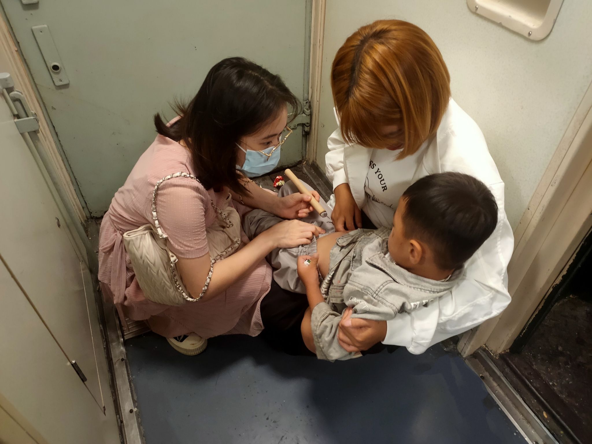 7月24日22點,由長沙客運段銅深車隊擔任松桃開往深圳東的K9263次列車運行到洞口至衡陽區(qū)間,加1號車廂列車員用對講機向列車長匯報,該車廂11號座位陳女士帶的一個小孩肚子疼痛厲害,列車長劉廣趕到現(xiàn)場,發(fā)現(xiàn)小孩表情特別痛苦,情緒很不穩(wěn)定,嘴里不斷地喊痛,小孩的母親和奶奶心急如焚。